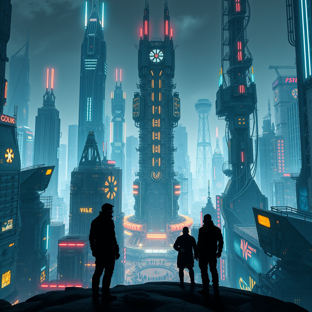 In a sprawling metropolis of towering futuristic skyscrapers and intricate cybernetic structures, a group of enigmatic figures stands amidst the bustling environment, their silhouettes outlined against the glow of neon lights. The city hums with the energy of countless machines, their mechanical components meshing in a symphony of technology and progress. Each structure in the horizon is a masterpiece of sci-fi architecture, adorned with complex details that tell a story of advanced civilization and innovation. The scene is captured with hyper-realistic clarity, each element contributing to a cinematic vision filled with stark contrasts and dynamic composition, showcasing a harmonious yet surreal blend of humanity and machinery in a world where the boundary between organic and synthetic is beautifully blurred.