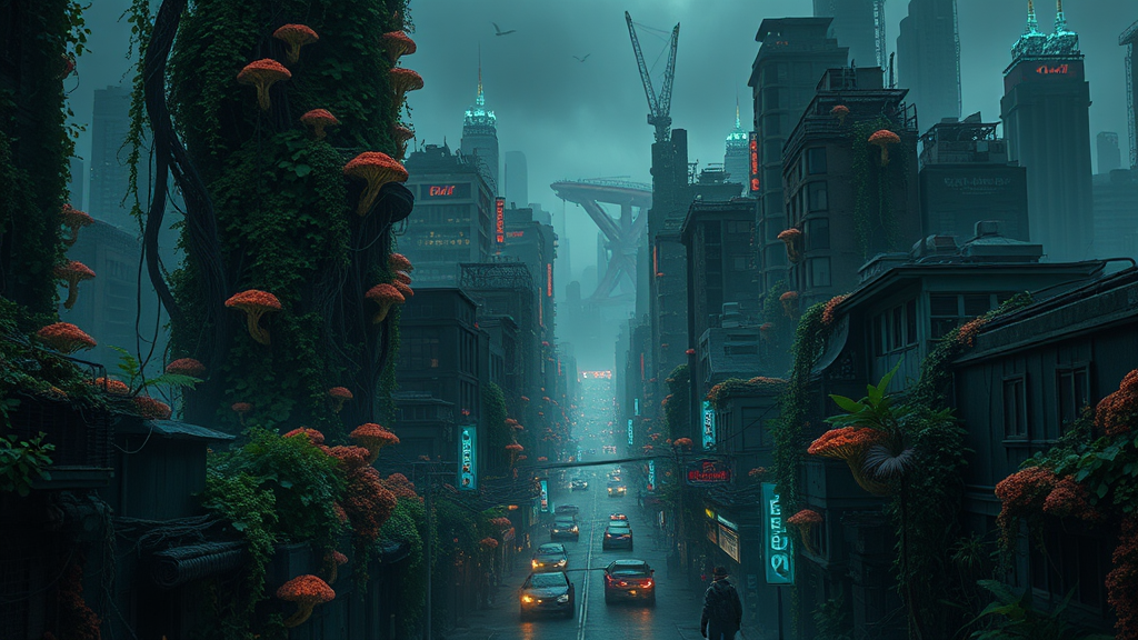 In a sprawling metropolis overrun by a peculiar strain of a fungal pathogen, the urban landscape has been consumed by nature's eerie beauty. Skyscrapers draped with cascading vines and vibrant fungal growths tower over desolate streets, where the echoes of past lives linger in the rustling leaves. The remnants of civilization are intertwined with this new ecosystem, where the line between life and decay blurs. Survivors navigate through a labyrinth of bioluminescent spores and labyrinthine alleyways, desperately seeking refuge amidst the chaos. The city breathes with an unsettling vibrancy, its air thick with the scent of damp earth and mystery, as the fungal organism weaves its way into every crevice, transforming the metropolis into a living, breathing entity of its own.