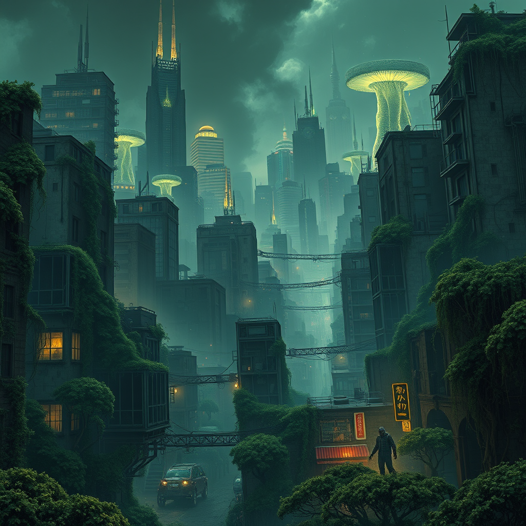 In a sprawling metropolis overtaken by the Ophiocordyceps fungus, the remaining inhabitants navigate a labyrinth of crumbling skyscrapers, overgrown streets, and dense fungal forests. This once-thriving urban landscape now pulses with the eerie glow of bioluminescent spores and is haunted by the transformed remnants of its former population. Survivors, driven by the instinct to endure, form fragile alliances as they traverse this hazardous terrain, constantly on guard against the ever-present threat of infection and the grotesque, mutated creatures that lurk in the shadows. In this unforgiving world, every building tells a story of the struggle and resilience of those who refuse to let the city fall completely to nature’s ruthless reclamation.
