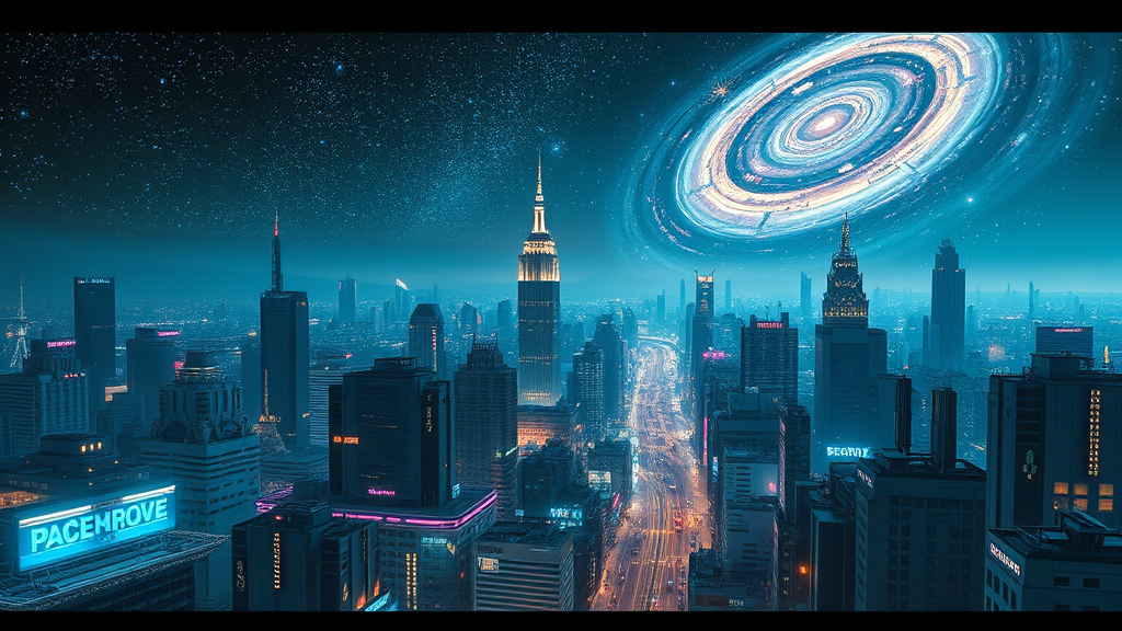 In a sprawling metropolis where neon lights flicker against the night sky, advanced robots navigate the bustling city streets. Above, galaxies swirl in the vast cosmic canopy, casting a mystical glow over the futuristic urban landscape.