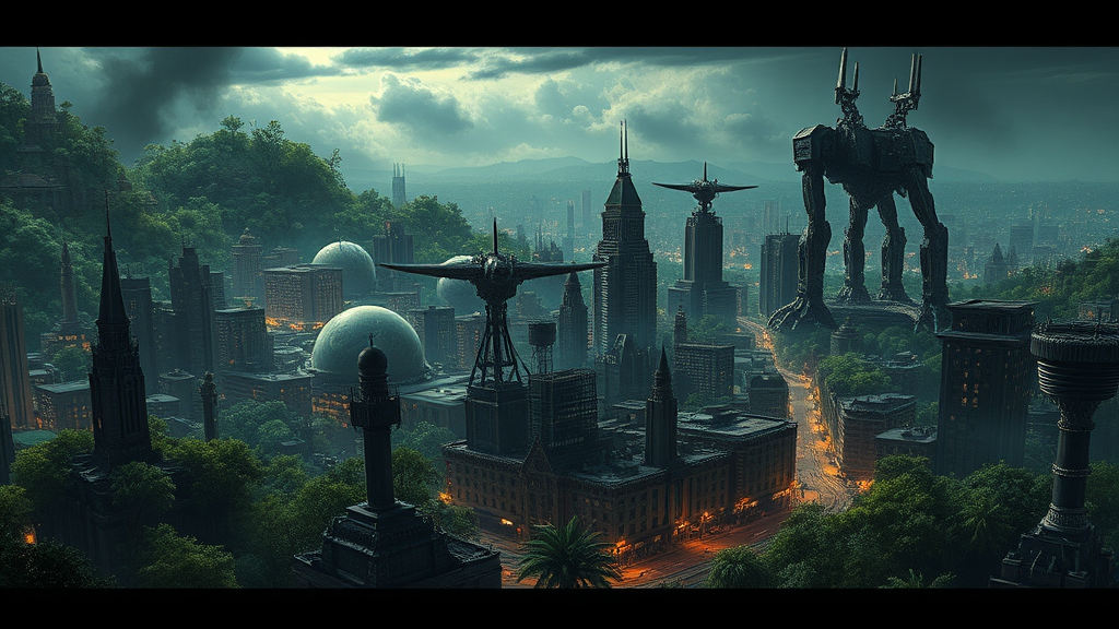 In a sprawling post-apocalyptic city, remnants of a once-great civilization are enveloped in dramatic chiaroscuro lighting that casts long shadows across the landscape, reminiscent of a world where nature reclaimed its throne amid towering mechanical beasts. The horizon is a brilliant display of nature's resurgence, with overgrown skyscrapers entwined in vibrant flora and surreal bioluminescence. Towering robotic creatures roam the shattered streets, their metallic forms both ominous and awe-inspiring. The scene is rendered in intricate ink-like detail, capturing the ethereal beauty and haunting desolation of a Final Fantasy-inspired universe, all in stunning 8k resolution, to bring out the depth and texture of this hauntingly beautiful, reimagined world.