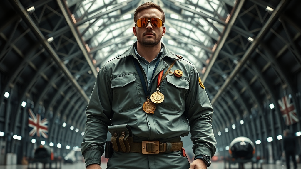 In a sprawling spacecraft hangar, a heroic male mechanic stands prominently, donned in a meticulously detailed formal Olive Fresh Nickel silver uniform with a touch of sci-fi and steampunk flair. Medals adorn his chest, reflecting his accomplishments. His utility belt, filled with essential tools, hangs at his waist, and golden pilot sunglasses cover his eyes, adding an air of mystery. The scene is set with dramatic cinematic lighting and captured from a low angle, enhancing his dynamic action posture. The fabric of his uniform showcases realistic details and folds, exuding craftsmanship. The background, a simple, low-contrast setting, subtly features hard surfaces and hints of a helmet. Nearby, the stars and stripes alongside the union jack add a sense of patriotic pride. Despite the complexity in front, the background remains unobtrusive and monochrome, allowing the mechanic to be the centerpiece of this 8k masterpiece. The character's face is rendered with the highest details, capturing the essence of heroism and determination.