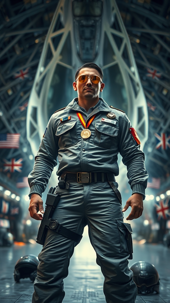 In a sprawling spacecraft hangar, a heroic male mechanic stands poised in an intricate, highly detailed formal Olive Fresh Nickel silver cloth uniform, embodying a fusion of sci-fi and steampunk aesthetics. Adorned with medals and a utility belt brimming with essential tools, he exudes confidence under dramatic cinematic lighting that casts dynamic shadows across his form. Captured in a low angle shot, his stance suggests readiness for action, with golden pilot sunglasses adding a touch of daring flair. The uniform's realistic fabric details and folds complement his determined expression, highlighted by high facial details that emphasize his character. Background elements are kept simple with subtle hints of flags like the Stars and Stripes and the Union Jack, while a helmet rests nearby, all underscored by the grandeur of a spaceship. The scene remains engaging and visually coherent, highlighting the mechanic's pivotal role in this masterpiece of 8k realism.