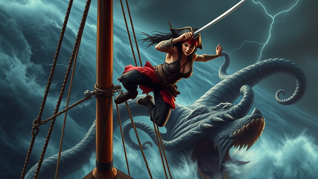 In a storm-tossed expanse of the Caribbean sea, a strikingly resolute female pirate captain with intricate tattoos, clad in weathered pirate attire reminiscent of Jack Sparrow, balances precariously atop the swaying mast of a formidable pirate ship. Her dark eyes glow with fierce determination as she launches herself into the turbulent air, both hands gripping a gleaming saber. Below, the enormous Kraken, a mass of churning tentacles, surges from the abyss, its sinister intent locked onto her ship. Undaunted, she releases a primal battle cry as she dives in a horizontal pose, ready to drive her blade into the monstrous sea creature's formidable head. Illuminated by flashes of lightning, she transforms into a whirlwind of fury and steel, descending from the towering mast onto the Kraken. The scene is captured in a hyper-realistic manner, showcasing extraordinary detail in both her fierce resolve and the chaotic backdrop of the furious storm.