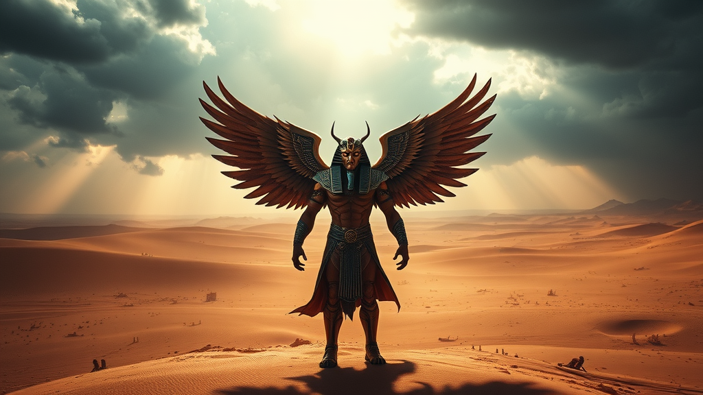 In a stormy desert landscape, the Egyptian god Horus descends from the skies, his eyes blazing with fury against mankind. Shadows cast upon the earth grow long and ominous as his presence fills the atmosphere with tension. Sinister and imposing, he stands in full, majestic regalia, wings outstretched, capturing the dramatic essence of a wrathful deity. The scene is photorealistic, cinematic, capturing every feather and detail of his divine armor as the tempestuous winds whip around him, symbolizing the unleashed power of an ancient god's rage.
