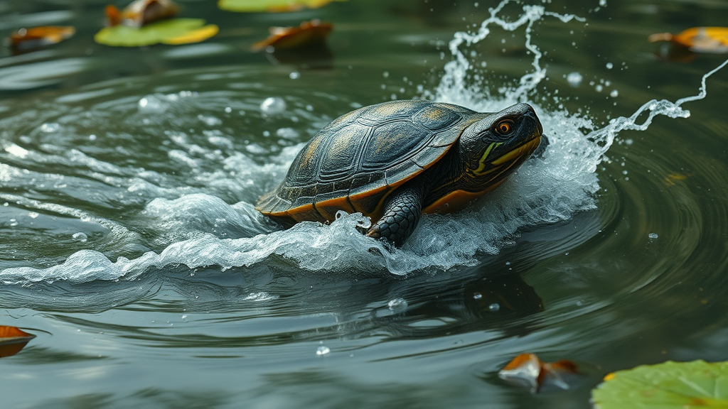 In a stormy pond, a frenzied turtle with glowing eyes moves at lightning speed, leaving a swirl of chaos in its wake.