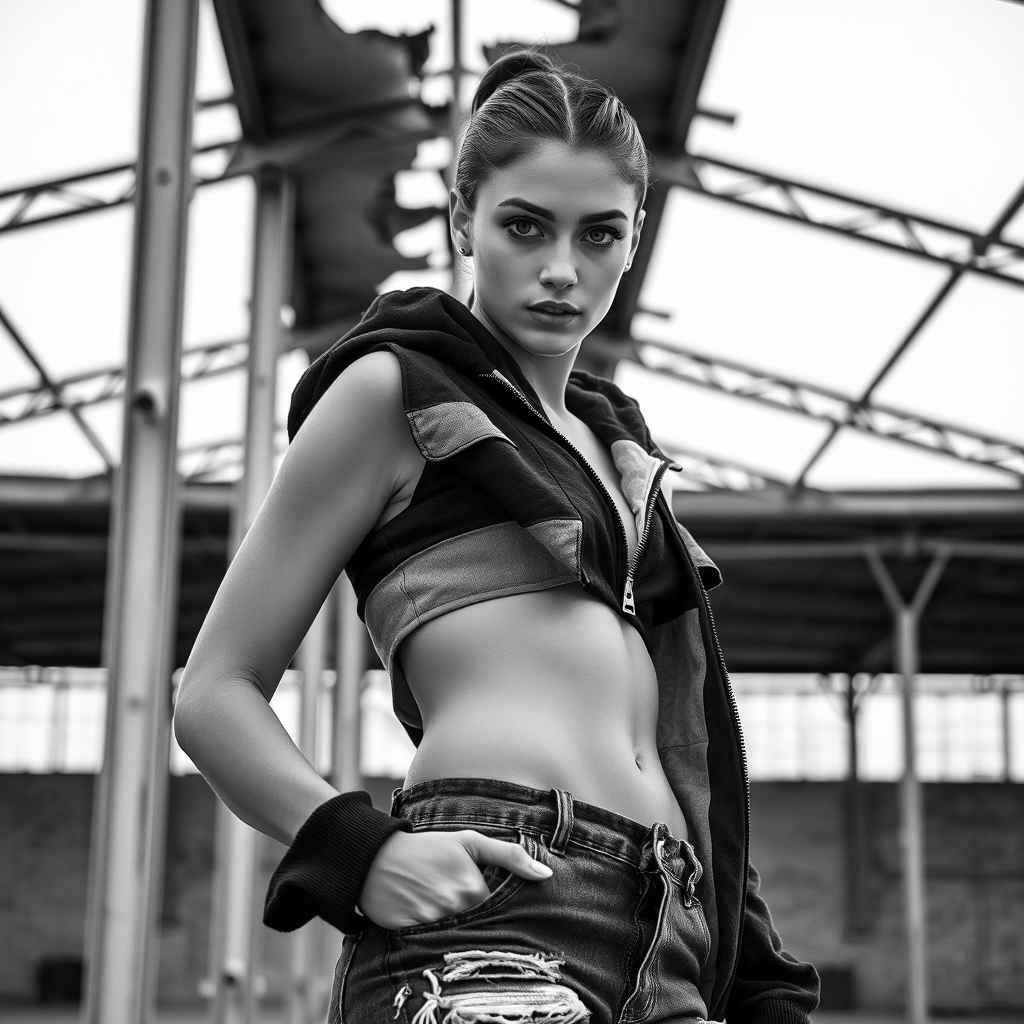 In a striking black and white photograph, a deconstructivist fashion scene unfolds with a distant view of a 24-year-old Fulani-Chechen female swimmer exuding graceful strength and curious wonder. Her sculpted physique showcases firm arms, smooth skin, toned muscles, and defined abs, accompanied by a small, flat chest. Her fair skin, with a natural sheen, gently reflects light and reveals the clarity of her skin pores and texture. Intriguing shield-shaped pale grey eyes, framed by long, elegant eyelashes, gaze outward with a subtle mystery. Curved, bushy eyebrows harmonize with her delicate facial features. She dons a unique ensemble of layered, patchwork hoodies with exposed zippers and a midriff-baring design, paired with distressed jeans sporting uneven cuts. Her body is turned to the side, one hand resting casually in a pocket, artfully composed according to the rule of thirds. In the background, fractured metal columns support a roof, reminiscent of Viviane Sassen's enigmatic style, adding an industrial yet artistic flair to the composition.