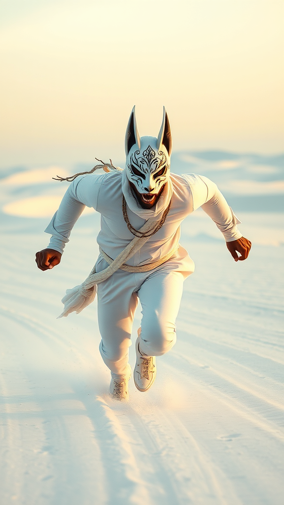 In a striking scene within the white sand desert, a man races towards the camera with intensity and poise. His dynamic pose captures the motion and energy of his sprint. Donning a kitsune mask, his attire cleverly blends traditional and futuristic elements. White face paint with intricate tribal patterns enhances his enigmatic appearance, while his sleek white suit echoes the stylings of a futuristic speed racer. The surroundings appear dreamlike, with vivid colors accentuating the ethereal quality of the landscape. The viewer is left with a sense of awe as the contrasting elements of tradition and modernity converge in this singular, captivating moment.