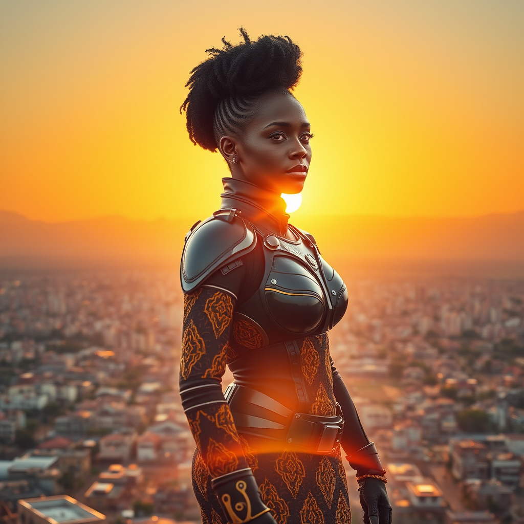 In a stunning cinematic frame, an Afrofuturistic Bissau-Guinean woman stands with authority and grace, overlooking the breathtaking Fouta Djallon landscape. She is a space captain, returning after a seven-year journey patrolling the far reaches of the Milky Way, and she stands proudly in her battle-ready Vibranium armor. Her attire is a blend of tradition and innovation, with intricate black and gold kente cloth patterns woven into her formidable protection. As she gazes resolutely towards the horizon, the golden hour sun envelops her in a warm glow, accentuating her confident and striking features. Behind her, the city—reminiscent of Wakanda—spreads out, a blend of futuristic architecture and cultural homage, welcoming her back. This powerful and photorealistic scene is inspired by the cinematic worlds of Interstellar and Black Panther, under the visionary direction of Ava DuVernay, capturing both the epic scale and intimate emotion of a warrior returning home.