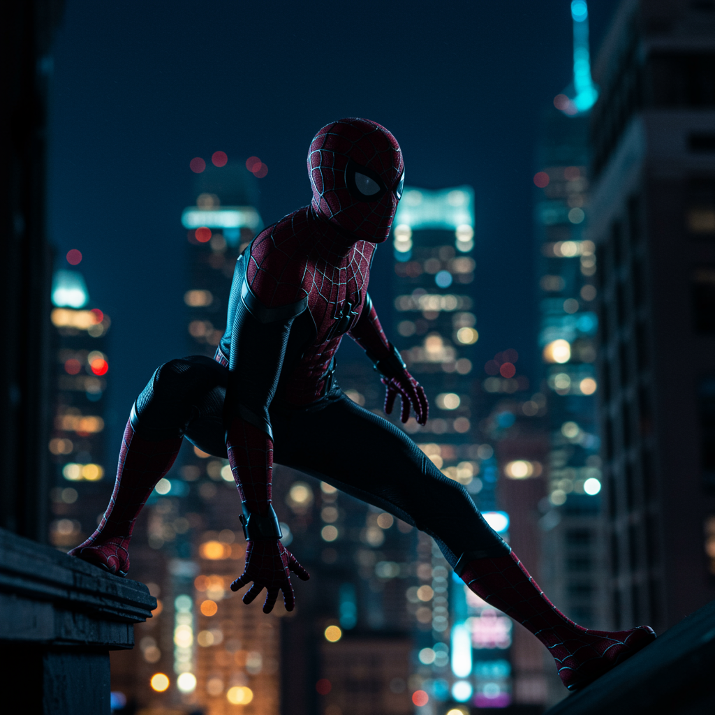 In a stunning display of high detail and super realism, Spiderman stands majestically in his sleek black suit, dramatically silhouetted against the vast expanse of the metropolis at night. Effortlessly clinging to a towering building with the strength of one powerful hand, the scene is a visual symphony of bright lights and towering skyscrapers that cast a luminous glow over the urban landscape, with dark shadows and mysterious alleys lurking below. Using a Canon EOS R5 with a Canon RF 24-70mm f/2.8L lens, the camera is set to an ISO of 200, with an aperture of f/2.8, and a shutter speed of 15 seconds. The white balance is set to auto, capturing the essence of the night, while a Manfrotto MT055CXPRO4 tripod and Canon BR-E1 remote shutter release ensure stability. The use of low-angle shots and innovative framing adds to the drama, emphasizing Spiderman's silhouette against the vibrant city lights, with small creative modifications enhancing the core vision without losing its essence.