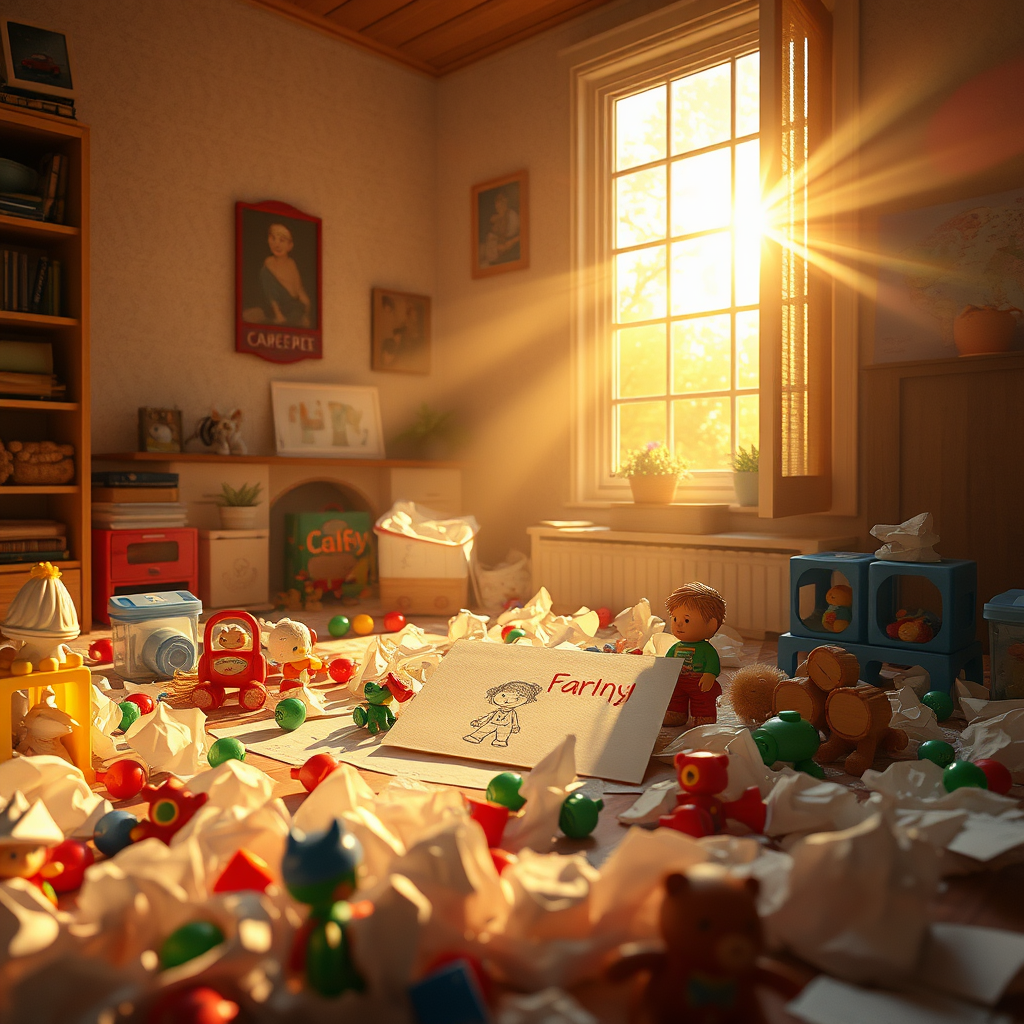 In a sun-drenched, cozy room alive with the spirit of play, colorful toys are scattered whimsically among crumpled papers, each a testament to a child's boundless creativity. A child's vibrant drawing captures the essence of their imagination under the warm glow of golden sunlight streaming through a large window. The scene is rendered in exquisite detail, showcasing a remarkable balance of vivid colors and lifelike textures. Every minute detail is captured in hyper-realistic, 8k ultra-high definition through a DSLR lens, achieving a masterfully intricate photograph. The precise color grading and post-processing highlight the interplay of light and shadow, creating a vibrant tapestry of depth and realism. Flawless ray tracing and physics-based rendering craft an immersive masterpiece of photo-realism, the highest quality capturing every nuance and form in sharp focus. All extraneous distortions and imperfections are absent, ensuring an immaculate and harmonious composition.