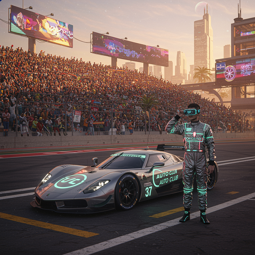 In a sun-drenched cyberpunk landscape, a sleek racing car emblazoned with a luminescent auto club logo sits poised on the futuristic track, its metallic surface shimmering in the neon glow of towering digital billboards. Beside it, a racing driver in a reflective, tech-infused suit adjusts his augmented reality visor with one hand while the other waves energetically to a crowd of fervent fans. The stands are packed with spectators, a sea of vibrant colors and digital screens flashing messages of support. From the vantage point to the side and above, the viewpoint captures a bustling scene of excited anticipation, with the distant skyline of a sprawling metropolis looming under a synthetic sunset.