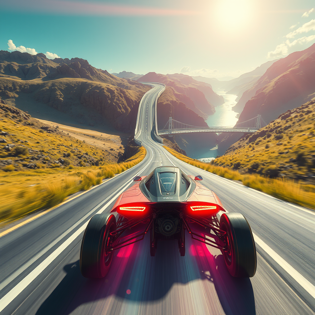 In a sun-drenched summer landscape, the cyberpunk raceway weaves through neon-lit fields, rising abruptly to the shimmering Convex Bridge spanning a glistening stream. The lead car surges forward, its sleek frame ablaze with electrified hues, ready to conquer the bridge. Suddenly—disaster strikes! The track betrays it; a yawning chasm looms ominously ahead, the only visible path swallowed by shadows. No other bridges in sight, the future of the race hangs in the balance. The camera captures the scene from a dynamic angle behind and to the side, accentuating the vehicle's cutting-edge design amidst the iridescent glow of the futuristic summer world.