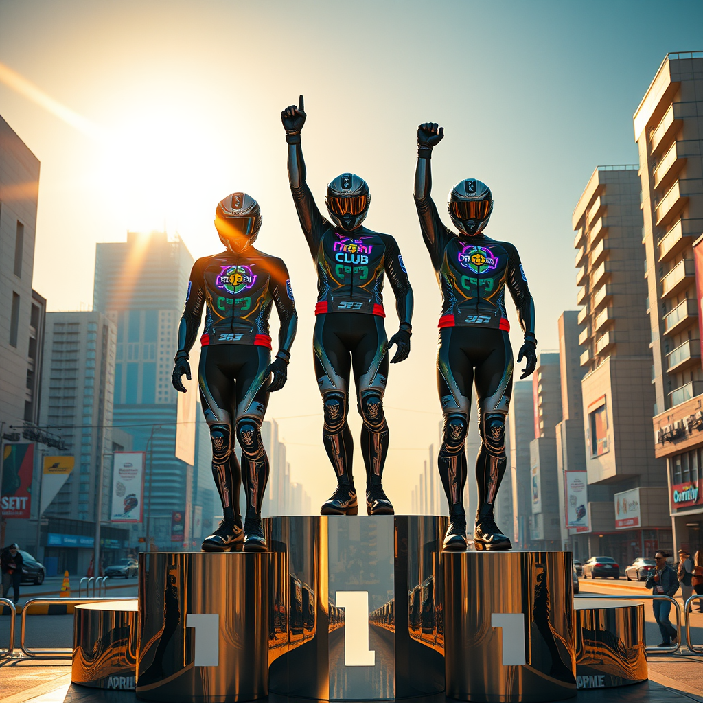 In a sunlit cyberpunk city, three riders stand triumphantly on a podium, their sleek, futuristic attire emblazoned with neon-lit logos of various high-tech clubs. The vibrant hues of the cityscape reflect off their gear as the camera gaze slightly from above and front, capturing the shimmering metallic textures and digital displays integrated into their clothing. The podium is an amalgamation of chrome and holographic elements, bathed in the golden glow of a setting summer sun that casts long shadows and adds a warm contrast to the cool, electric tones of the riders' outfits.