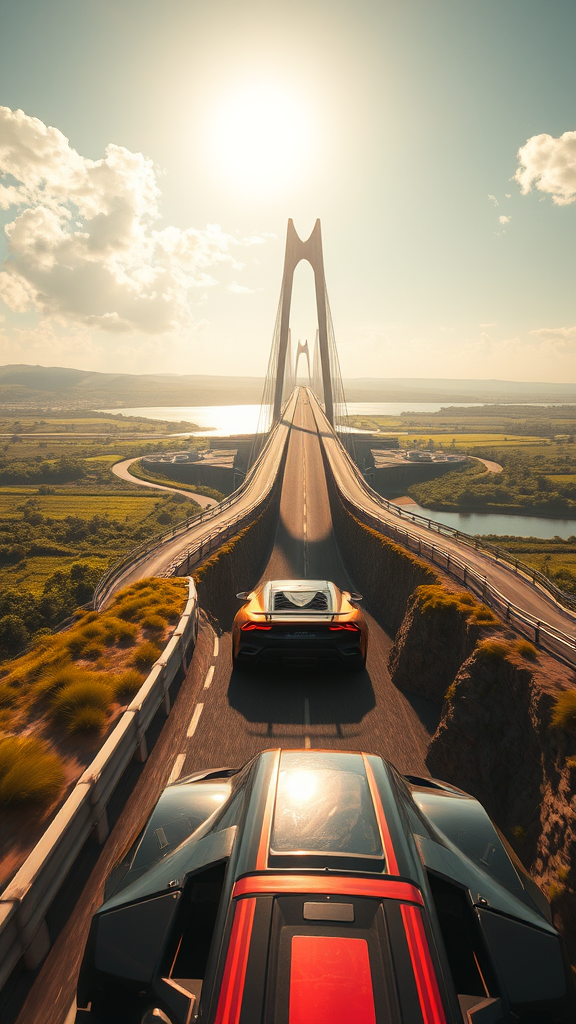 In a sunlit cyberpunk landscape, the summer heat shimmers off the track as the route winds through lush fields, leading to the futuristic Convex Bridge arching over a shimmering river. With high tension, the leading car begins its ascent onto the bridge, only to encounter sheer horror—a catastrophic failure on the track! The road collapses into a daunting pit just ahead of the lead racer. The absence of other bridges underscores the peril. The route beyond disappears into a haze of uncertainty. The camera angle captures the thrilling moment from behind and slightly off to the side, emphasizing the brilliant sunlight reflecting off the car as it navigates this precarious challenge in the race.