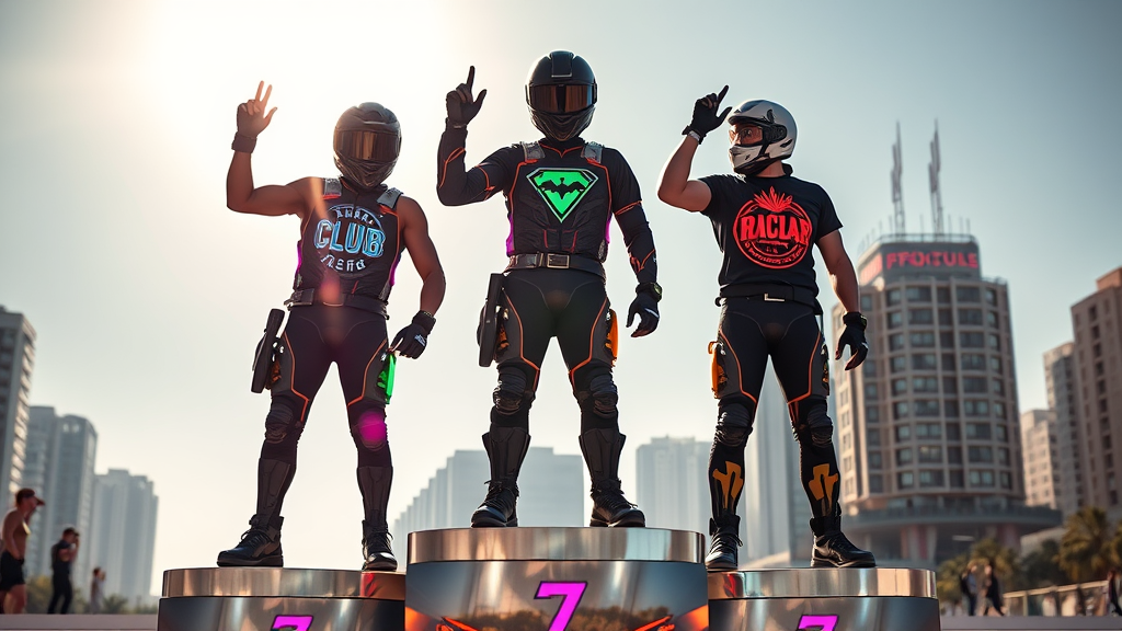 In a sunlit futuristic city, three riders stand triumphantly on a neon-lit podium, their attire emblazoned with vibrant, holographic logos of various clubs. The camera captures the scene from a slightly elevated, frontal angle, contrasting the glowing sunlight with the vivid neon colors of their cyberpunk gear, reflecting off sleek metallic surfaces. The riders, with tech-enhanced accessories, cast striking silhouettes against the urban skyline, embodying the essence of cyberpunk rebellion and summer victory.