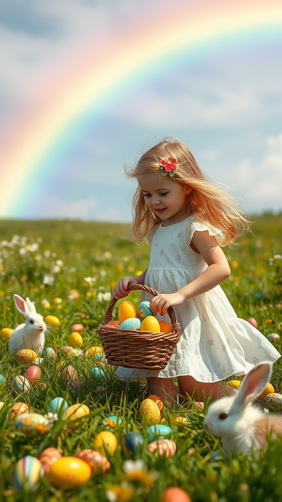 In a sunlit grassy meadow, a young girl with golden hair joyfully explores, her white dress adorned with a subtle floral pattern fluttering in the gentle breeze. Around her, an array of colorful Easter eggs, each with unique designs, are scattered, creating a vibrant carpet of colors. She carries a woven basket overflowing with these bright treasures. Nearby, a fluffy white bunny playfully peeks out from behind a bush, its eyes wide with delight. Above, a breathtaking rainbow arches gracefully across the sky, enhancing the magic of the scene with its brilliant hues. The atmosphere is warm and inviting, capturing the essence of a perfect spring day.