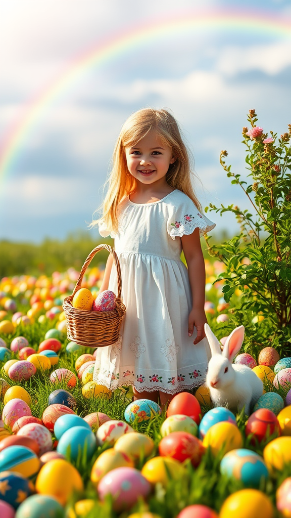In a sunlit meadow, a young girl with golden hair stands amidst a sea of vibrant Easter eggs in various sizes and intricate designs. The sunlight bathes the scene in a warm, welcoming glow. Dressed in a white frock adorned with delicate floral patterns, she carries a handcrafted basket brimming with vividly colored eggs. Nearby, a playful white bunny peeks out from behind a leafy shrub, its tiny nose twitching with anticipation. In the background, a brilliant rainbow arches across the sky, infusing an extra touch of enchantment to the idyllic landscape.