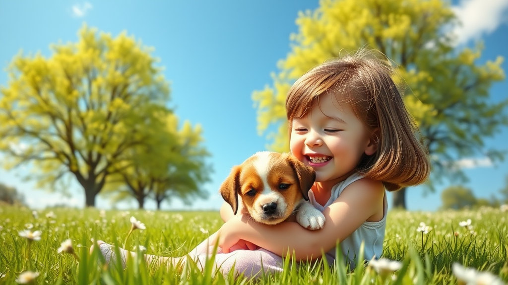 In a sunny meadow under a clear blue sky, a charming puppy with floppy ears snuggles contentedly in the embrace of a joyful young girl. The vibrant green trees sway gently in the background as they both bask in the warmth of a perfect spring day. The scene captures the whimsical style reminiscent of Charles M. Schulz, with its playful and heartwarming essence.