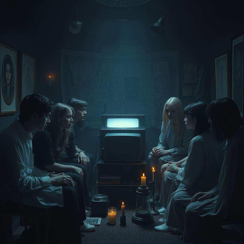 In a surreal and ethereal setting straight out of a 1982 supernatural mystery thriller, a diverse group of individuals gather around a computer, a symbol of artificial intelligence, reflecting on the essence of an esoteric and dreamy existence. This scene unfolds with a composition reminiscent of tarot card art, drenched in low-key lighting that casts a dark and cool aesthetic across the room, enhancing its mysterious allure. The atmosphere is charged with strange circumstances and unique elements—symbols, artifacts, and subtle nods to the arcane—creating a strong balance between the expressive power of the scene and the sense of wonder it evokes. Each character in the tableau seems to tell their own story, adding layers to this enigmatic tapestry. The resolution is ultra-clear, enhancing the vivid details that contribute to the setting’s raw, cinematic feel, as if each frame were a window into a parallel, esoteric realm.