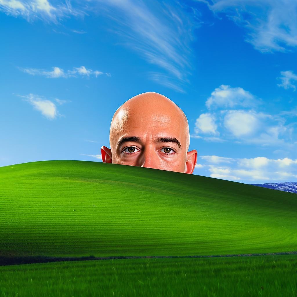 In a surreal and slightly humorous scene inspired by the iconic Windows XP "Bliss" background, the landscape features vividly green rolling hills under an expansive clear blue sky. Peeking from behind one of the hills is the top portion of Jeff Bezos's head—his eyes and forehead—emerging with a curious intensity. His head is slightly tilted and gazes directly at the viewer with an unsettling, inquisitive expression, as though he is clandestinely observing from afar. A gentle breeze rustles the grass, adding a touch of whimsical reality to the peculiar scene.