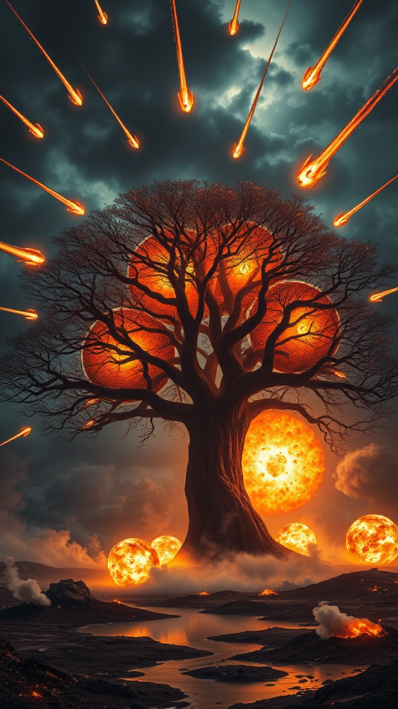 In a surreal, apocalyptic landscape, a massive tree looms at the center, its form reminiscent of a human kidney. Its branches spread wide, mirroring intricate alveoli patterns that faintly glow with fiery cracks, embodying life and vulnerability amidst chaos. The sky is a theater of destruction as fiery comets streak through the darkness, each leaving trails of embers and ash behind. Some are mid-flight while others crash into the earth, triggering explosive eruptions of debris, smoke, and flames that consume the surroundings. Below, a once serene lake now thrashes violently, portions vaporizing into mist under the relentless heat and detonations. The land is scarred, with charred hills as backdrop and smoke plumes rising ominously among impact craters encircling the tree. The sky above is a tumultuous canvas of dark grays interwoven with the fiery reds and faint oranges of a disappearing sun, desperately trying to emerge through the destruction. The explosive flashes illuminate the battlefield with a dramatic, cinematic glow, casting sharp shadows and accentuating the chaos. This apocalyptic scene captures the climactic essence of an epic battle, where destruction and the fragile symbol of life converge, vividly portrayed with dynamic movement, vibrant hues, and intricate details of fire, smoke, and devastation.