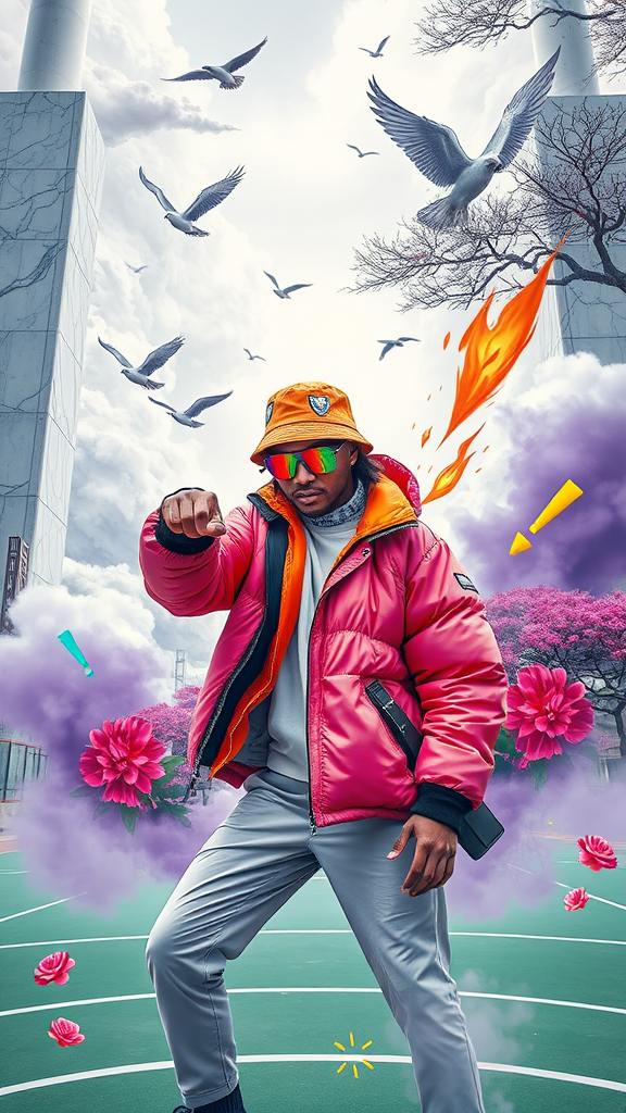 In a surreal blend of fashion and culture, a photo captures a person striking a dramatic action pose on a basketball court in Tokyo, adorned with mirrored lenses and a unique, artistic bucket hat. The backdrop features impressive marble structures and mystical white and purple trees. They wear a bold, vibrant streetwear puffy jacket, designed with architectural leather elements, enveloped in illustrated billows of smoke, flickering flames, and soaring birds. The scene is enriched with bursts of colorful flowers and swirling fog, while exclamation marks, radiating lines, and ASCII characters add a dynamic energy to the composition.