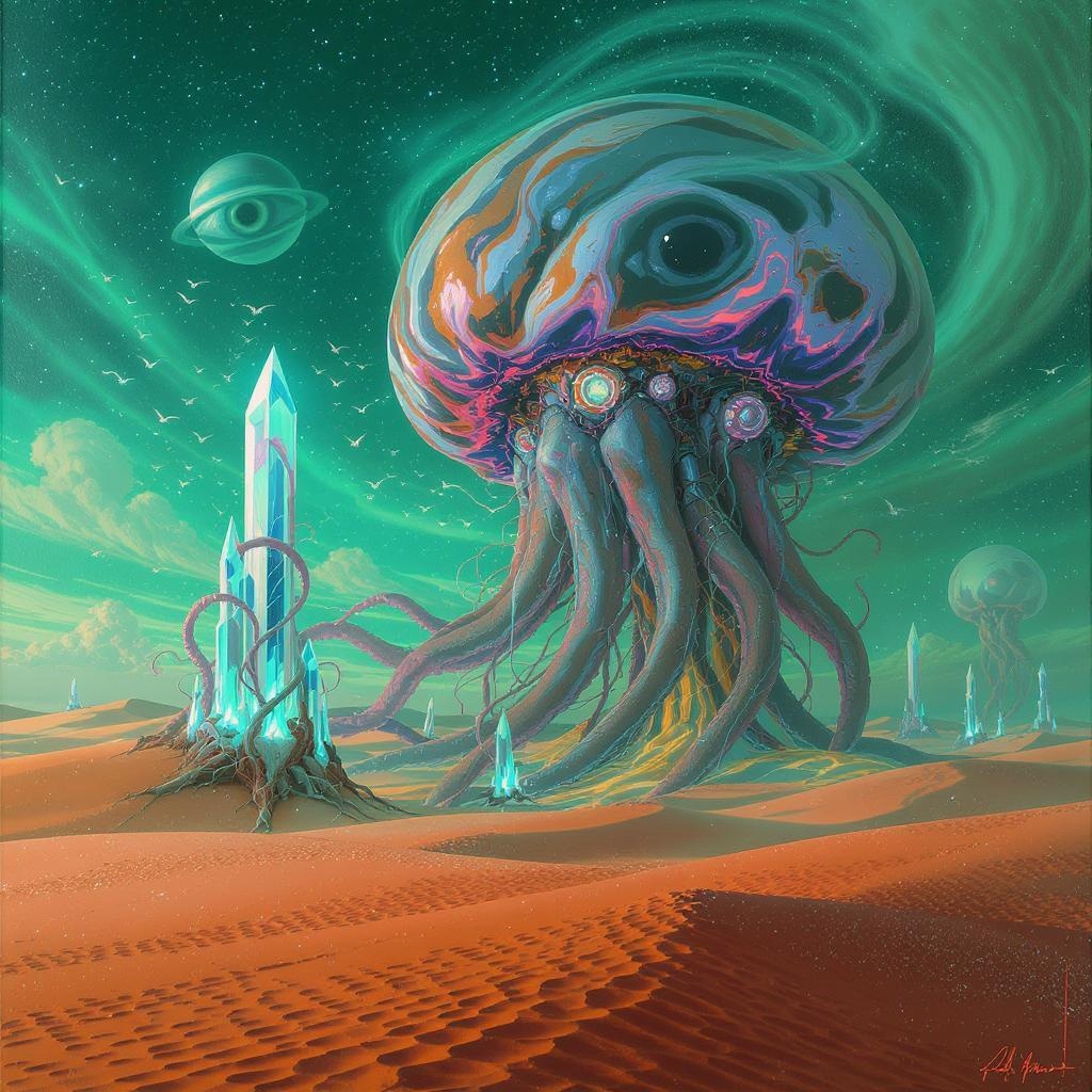 In a surreal desert landscape under an emerald sky, a colossal floating creature resembling a cross between an octopus and a jellyfish casts kaleidoscopic shadows on the sands. Towering crystalline structures rise from the ground, pulsating with a bioluminescent glow. Among these, peculiar mechanical vines appear to grow, twisting and twitching as they absorb iridescent light from the surroundings. In the distance, an enormous metallic eye hovers, scanning the horizon with a disquieting omnipresence, while flocks of translucent, winged orbs spiral in erratic, mesmerizing patterns. The air hums with an unidentifiable energy, creating a sense of both awe and unease in this bizarre, unfamiliar world.