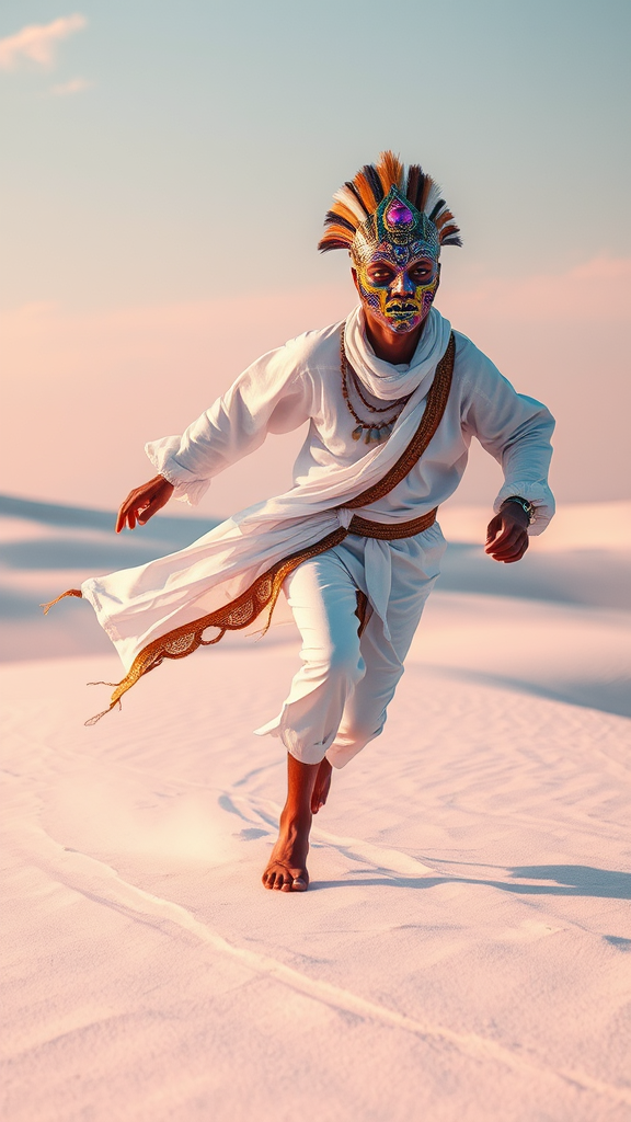 In a surreal landscape, a man with a vibrant tribal mask adorned with swirling patterns sprints gracefully across a pristine white sand dune, his oversized white attire billowing in the breeze. The intricate tribal details of his clothing shimmer with iridescent hues under the sun, casting an ethereal glow. This dreamy scene is infused with a kaleidoscope of bright, futuristic colors, reminiscent of enchanting anime aesthetics. The atmosphere feels like it's animated by the magic of a Studio Ghibli film, combining elements of wonder and serene beauty as the man maintains eye contact with the viewer, a glint of adventure in his gaze.