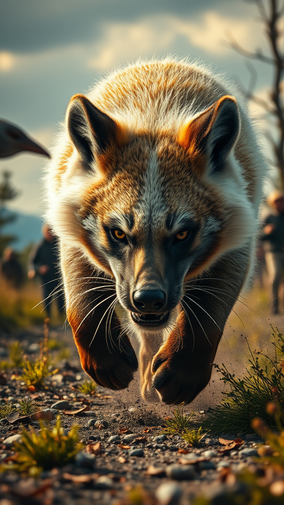 In a surreal world of 'worshipers', an enigmatic creature known as the wolverine emerges, captured in the cinematic clarity of a Wollensak 127mm f/4.7 Ektar lens. Fantastical landscapes stretch into the horizon, where distinctive noses and fierce eyes define the residents of this realm. The wolverine charges through scenes filled with intense, brutal action, its fur shimmering with a radiant white and gold hue. Close-ups capture every second of its raw power and agility, evoking a sense of wonder and danger in a mystic, untamed land.