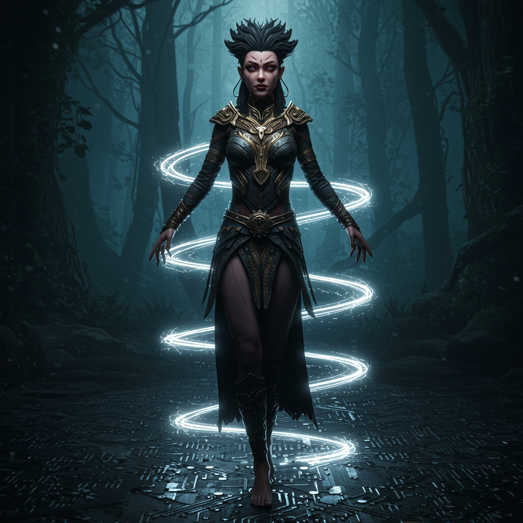 In a swirling backdrop of luminous spiral lightning, a resplendent young woman with an exquisite and flawless visage stands confidently upon a ground resembling a circuit board. Clad in ornately detailed attire, she assumes an elegant pose, exuding an aura of fantasy. The scene’s artistry is reminiscent of a dark fantasy tribal universe, hyper-maximalist and intricately designed, embodying cinematic grandeur. Her face is meticulously detailed, set against a backdrop of epically moody woods, rendered in breathtaking 8k resolution. The ultra-detailed 3D Octane render enhances the photorealistic concept art's sharp focus and perfect composition. With an enigmatic, malevolent smile, her eyes sparkle with madness, and every feature - from her hands to her eyes and lips - achieves perfection. The scene serves as a captivating wallpaper in HDR, with unparalleled high-definition quality.