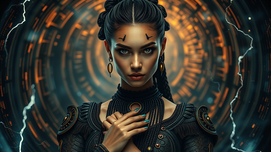 In a swirling storm of electric spirals, a magnificent young woman stands poised against a backdrop of intricate circuitry, her expression a perfect blend of beauty and intensity. Her intricately detailed clothing weaves a tapestry of tribal dark fantasy, complementing the moody, epic forest that frames her presence. Her face is a masterpiece of realism, with eyes that glint with wild intensity and lips curved in an enigmatic, almost mischievous smile. This hyper-detailed cinematic portrayal captures the essence of maximalist art, rendered in 8k resolution for a stunningly lifelike effect. Her stance is elegant and commanding, each detail—her flawless hands, piercing eyes, and vivid expression—crafted with precision in sharp focus. The scene exudes a photorealistic concept that pushes the boundaries of imagination, perfect for high-definition backgrounds, embodying an HDR quality that mesmerizes and captivates.