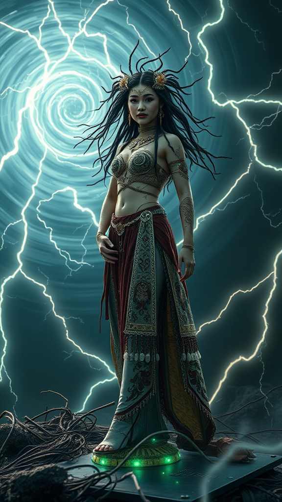 In a swirling storm of electric spirals, a radiant young woman stands confidently, her flawless face illuminated by the flashes of lightning. She embodies realism in a full-body depiction, grounded on a circuit board, clad in elaborate attire. Her stance is graceful, exuding an air of fantasy with intricate details that echo tribal dark fantasy, crafted with hyper-maximalist precision. Her face is intensely detailed, set against the backdrop of an epic, moody woodland. Rendered in ultra-detailed 8k quality through a 3D Octane process, she is a photorealistic masterpiece. The sharp focus and immaculate composition highlight her sinister smile, wild eyes, and exquisitely perfect hands, eyes, and lips. The piece serves as a high-definition wallpaper, utilizing HDR technology to achieve unparalleled quality and definition.