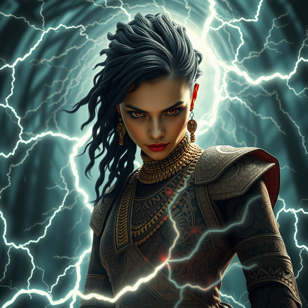 In a swirling vortex of spiral lightning, a magnificent young woman stands with an air of regality; her face is a paragon of beauty, captured with realistic precision in full body. Her feet are grounded in an intricately etched circuit board, while her attire dazzles as an array of complex, hyper-maximalist patterns woven into her clothing embodying tribal dark fantasy. The scene is enriched with an epic-moody woodland backdrop, the entire composition rendered in ultra-detailed quality, an 8k resolution 3D Octane masterpiece. Her expression, an intriguing mix of an evil smile and wild eyes, draws you in, complimented by perfect features — hands, eyes, lips, all impeccably crafted. This photorealistic concept art serves as an enrapturing wallpaper, bathed in HDR, presenting a high-definition, immersive snapshot of cinematic brilliance. The focus is sharp, the composition flawless, blending fantasy and reality seamlessly.