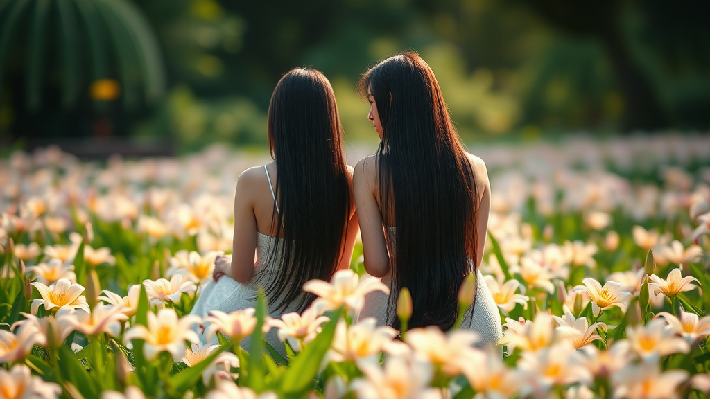 In a tranquil expanse of lilies, two captivating Japanese women with long, lustrous jet-black hair flowing down to their hips, sit gracefully facing one another. Their serene presence enhances the natural beauty surrounding them, as the gentle breeze stirs the flowers, their elegant forms complemented by the vibrant colors of the field. The soft sunlight casts a golden hue, highlighting their features and creating an enchanting scene of harmony and allure.