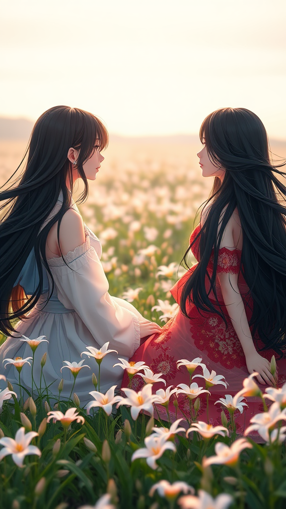 In a tranquil field adorned with delicate lilies, two captivating Japanese women with flowing hip-length ebony hair sit gracefully opposite each other, their enchanting presence harmonizing with the serene surroundings.