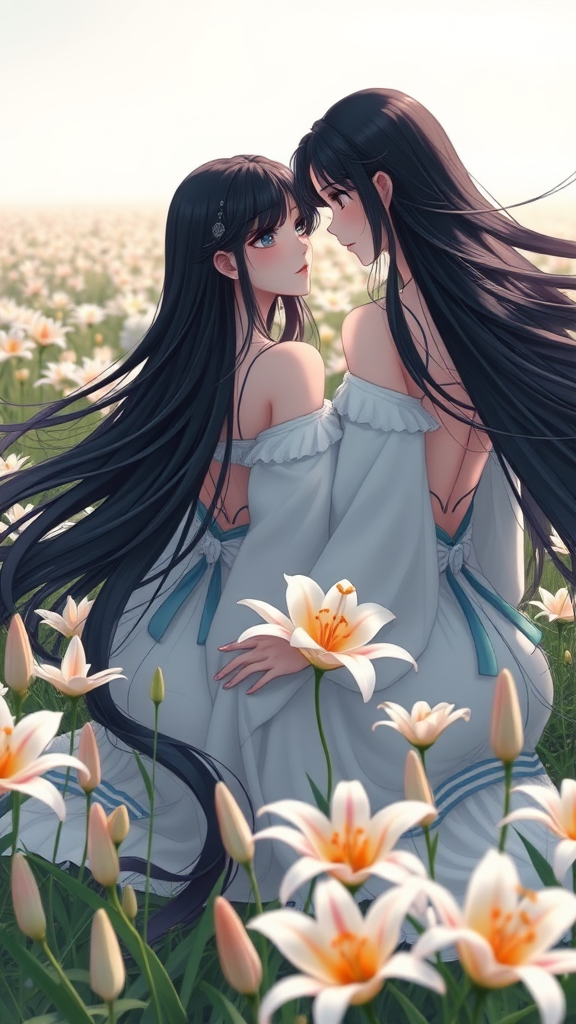 In a tranquil field of blooming lilies, two enchanting Japanese women with flowing jet black hair cascading down to their hips sit gracefully, their captivating eyes locked in a shared moment of serenity.