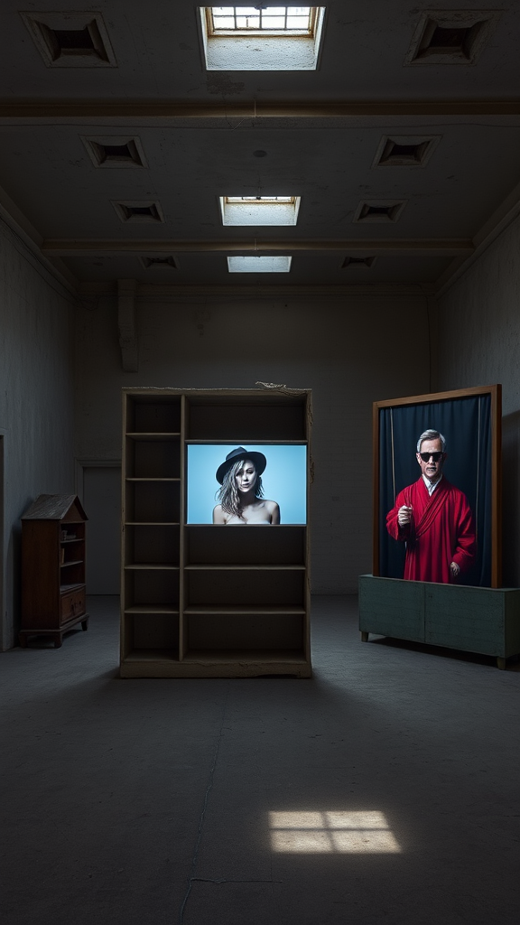 In a vast, abandoned space seen from above, with dim natural light filtering through small ceiling windows, three unique sculptures occupy the emptiness, their presence accentuated by the glow of video projectors. At the center stands "Sculpture One," a slightly damaged plaster representation of a classic wooden living room bookcase, revealing parts of its metal framework. Its empty shelves serve as a canvas for a 16mm film projection, featuring a black and white image of a half-naked Portuguese girl donning an urban hat. To the right, "Sculpture Two" spans like a semi-open folding screen, crafted from paper with a wooden frame, echoing the style of an ancient Japanese Nanban screen. A colorful video projection casts the face of a biblical character in red attire and sunglasses, set against a serene blue sky. On the left, "Sculpture Three" exhibits a puppet theater made of wood and Alentejo textiles, housing the "Bonecos de Santo Aleixo" puppets that appear to be sleeping. This theater is notably smaller than the other sculptures, yet all three are dwarfed by the cavernous room they inhabit. The dim environment is softly illuminated by the delicate interplay of natural light and the beams from the projectors, casting ethereal shadows across the scene.