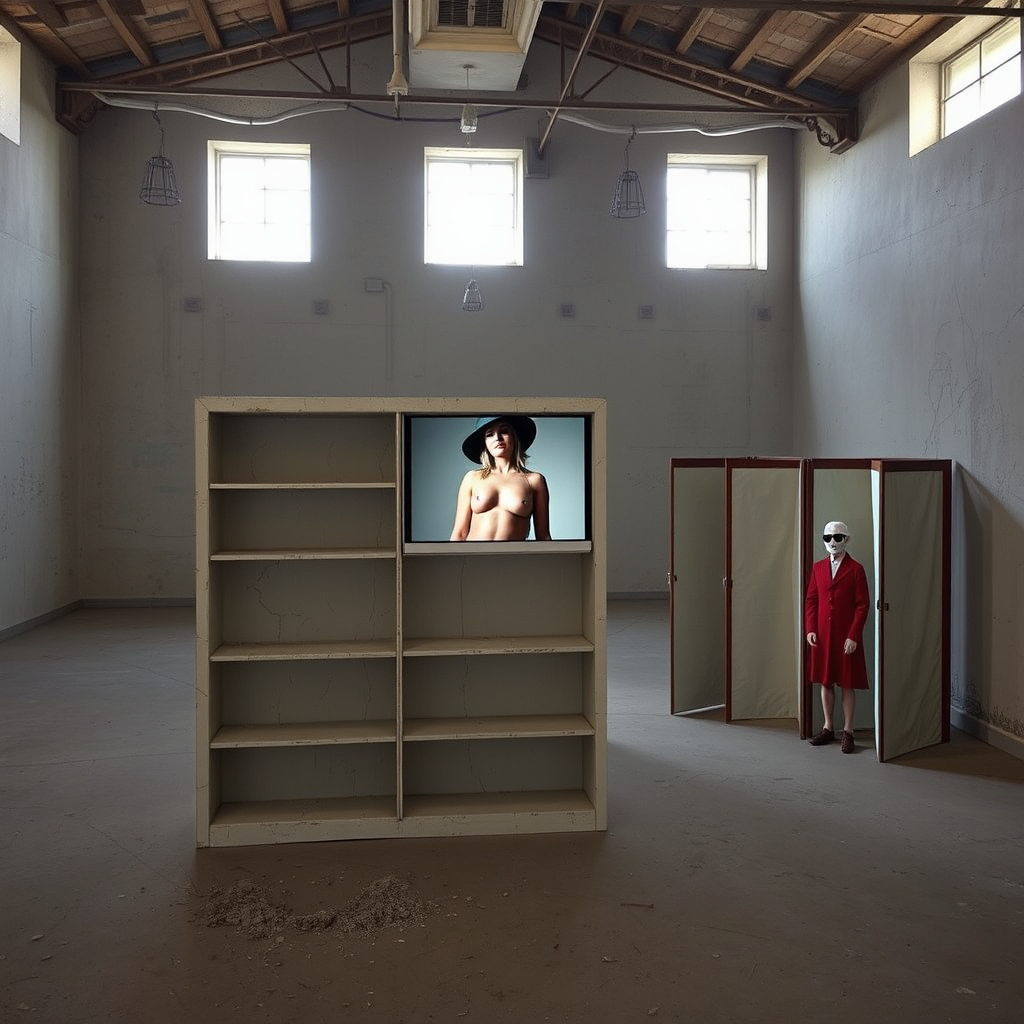 In a vast, abandoned space viewed from above, dimly illuminated by sparse natural light filtering through narrow ceiling windows, three distinct sculptures occupy the desolate environment. In the center stands "Sculpture One," fashioned from worn plaster mimicking the archetype of a classic wooden bookcase, its metal framework exposed through cracks. The texture of plaster and metal is palpable. Across its barren shelves, a vintage 16mm projector casts a black and white film of a half-naked Portuguese girl donning an urban hat, aligned seamlessly on the sculpture’s surface. To the right, "Sculpture Two" presents a paper folding screen with a wooden frame, reminiscent of a Japanese Nanban design yet devoid of ornamentation, partially unfolded. It acts as a canvas for a vibrant projection of a biblical figure in red attire, sunglasses perched against a backdrop of blue sky, confined to just the character's face. On the left, "Sculpture Three" showcases a diminutive puppet theater made from wood and Alentejo textiles. Inside, the small-scale "Bonecos de Santo Aleixo" puppets appear asleep within their snug confines. These sculptures, although intricate, are dwarfed by the vastness surrounding them, their presence highlighted only by the muted glow of the projection lights, casting a haunting yet intriguing ambiance across this immense, forgotten space.