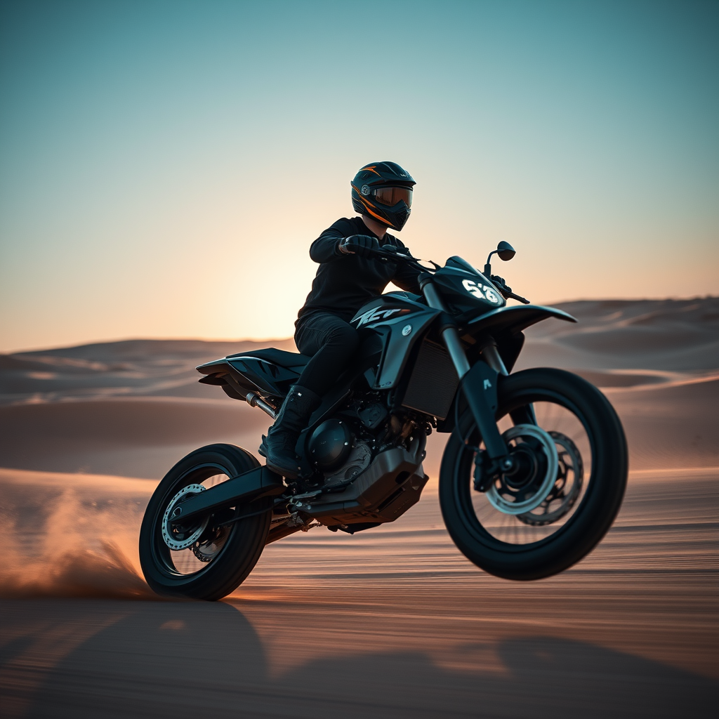 In a vast desert setting, a young man clad in sleek black attire expertly maneuvers an advanced carbon-fiber electric dirt bike. The futuristic battery-powered motorbike glimmers under atmospheric lighting, captured in a wide scenic shot with a low-angle perspective that highlights its sophisticated design. The composition is dynamic, emphasizing high-speed action with a thrilling wheelie and subtle motion blur that accentuates movement. Shot in 8K UHD, the image features professionally color-graded tones that create a moody ambience beneath a deep blue sky enhanced by a polarizing filter. The scene is devoid of any vignette, offering a pure and untainted view of this modernist adventure without distractions.