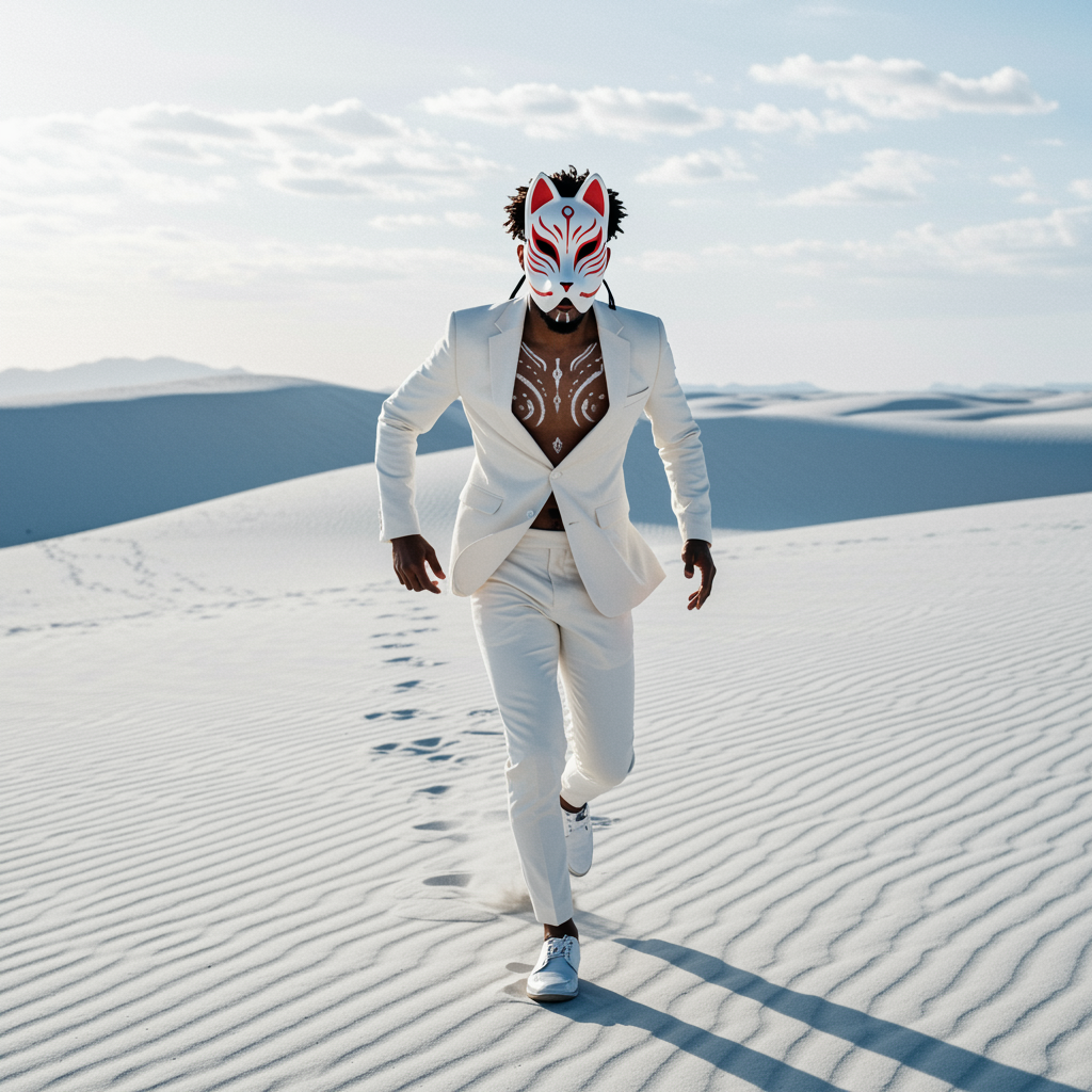 In a vast expanse of shimmering white sand dunes under a radiant sky, a man bolts across the desert with a dynamic, captivating pose, his gaze locking with the camera. He dons a striking kitsune mask, accentuating his enigmatic aura, complemented by elaborate white face paint with intricate tribal patterns. Clad in a crisp white suit that exudes a futuristic speed racer vibe, his outfit blends the mystique of kitsune folklore with a sleek modern edge. The scene envelops the viewer in low detail, evoking a dreamlike atmosphere enhanced by vibrant colors and an overwhelming sense of wonder.