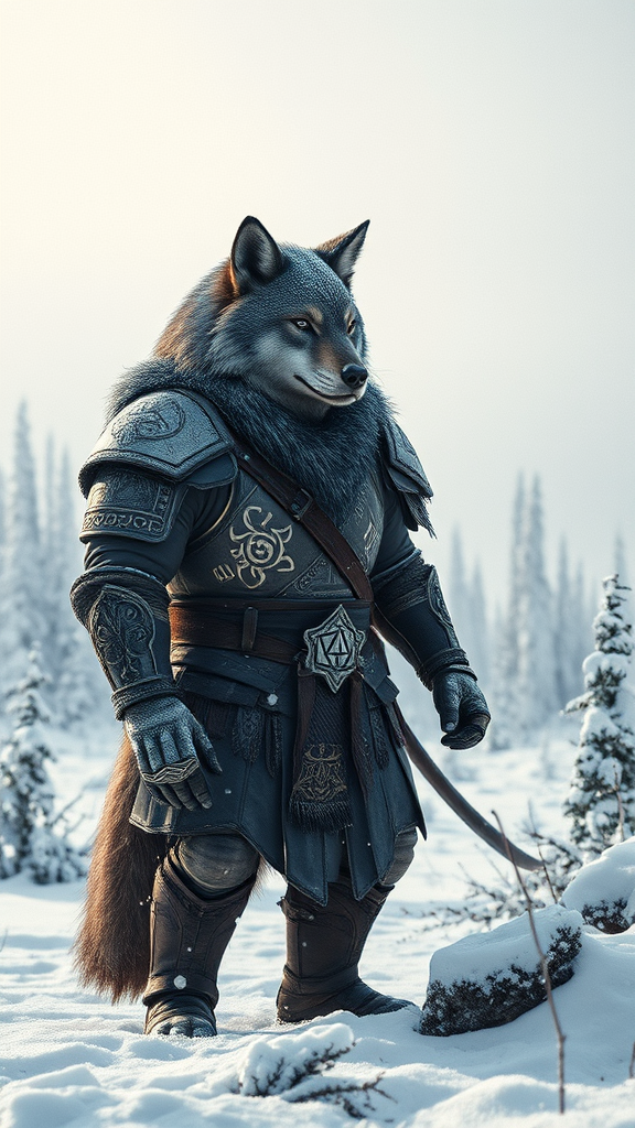 In a vast expanse of snow-covered wilderness, an imposing anthropomorphic wolf warrior stands poised, exuding an aura of ferocity and determination. Clad in intricate armor embellished with runic markings, the figure embodies both fantasy and the thrill of D&D adventure. Every piece of the armor is masterfully crafted, showcasing a hyper-detailed, realistic design that captures the eye. The scene is illuminated by dramatic, cinematic lighting, highlighting the delicate snowflakes dusting the warrior's fur and armor. Beneath the watchful gaze of a pale winter sky, the composition is a masterpiece of realism, echoing the intensity and majesty of this legendary creature. The image is rendered in stunning 32k UHD detail, capturing the essence of a storied world.
