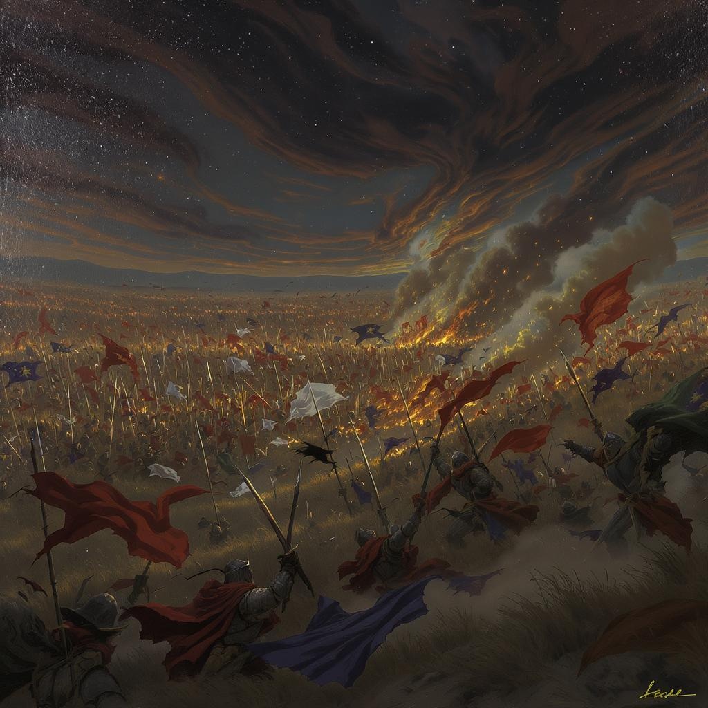 In a vast medieval battlefield set within a fantasy world, hundreds of brave warriors clash under a dark, atmospheric sky. The digital art captures the essence of the epic war, with glowing effects illuminating the scene. The hand-drawn elements combined with an 8k octane render in Cinema 4D and Blender bring the image to life, boasting sharp focus and a humorous yet majestic tone. Vivid colors and a professional oil painting style reminiscent of Ed Binkley, Atey Ghailan, Studio Ghibli, Jeremy Mann, Greg Manchess, and Antonio Moro create a stunning and intricate masterpiece. The scene embodies the photorealistic detail trending on ArtStation and CGSociety, with a modelshoot-style presentation that engages the viewer. Despite the dramatic and hyperrealistic approach, a touch of surrealism is added with weird colors and occasionally blurred elements. The artwork avoids common imperfections like extra limbs or disfigured anatomy, maintaining a harmonious and visually engaging composition.