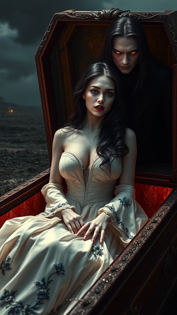In a vast, ominous landscape, an intense and eerie scene unfolds. At the image's heart, a female vampire emerges from a finely crafted coffin, her eyes shimmering with an otherworldly brilliance. Her skin is a ghostly, ethereal pale, hinting at her supernatural lineage. Her dark hair cascades elegantly down her back, glinting subtly in the dim light, with shimmering highlights. She dons a long, flowing gown of pristine white, adorned with a delicate pattern of blue flowers embroidered along the edges. The gown, though opulent, is frayed and torn, its shimmering threads catching the light in a haunting dance. Her lips, painted a deep crimson, are slightly parted, revealing her sharp, pointed fangs, with a faint, crimson glow at their corners. Behind her stands a male vampire, his eyes also glowing with an intense, supernatural light. His skin shares the same ethereal pallor, and his long, dark hair flows majestically, with gleaming highlights. Draped in a long, flowing cloak of deep red, his attire mirrors the intricate and torn elegance of the female vampire’s gown. His lips echo the bold red hue, parting to reveal sharp teeth and a subtle crimson glow. To the left, twisted trees, their branches like skeletal fingers, loom against a swirling, storm-brewing sky, creating a stark silhouette. To the right lies the ornate coffin with its carved wooden embellishments, lined with soft, luxurious silk or satin. The scene exudes a suspenseful atmosphere filled with eerie anticipation, as if something mystical and otherworldly is on the brink of emerging.
