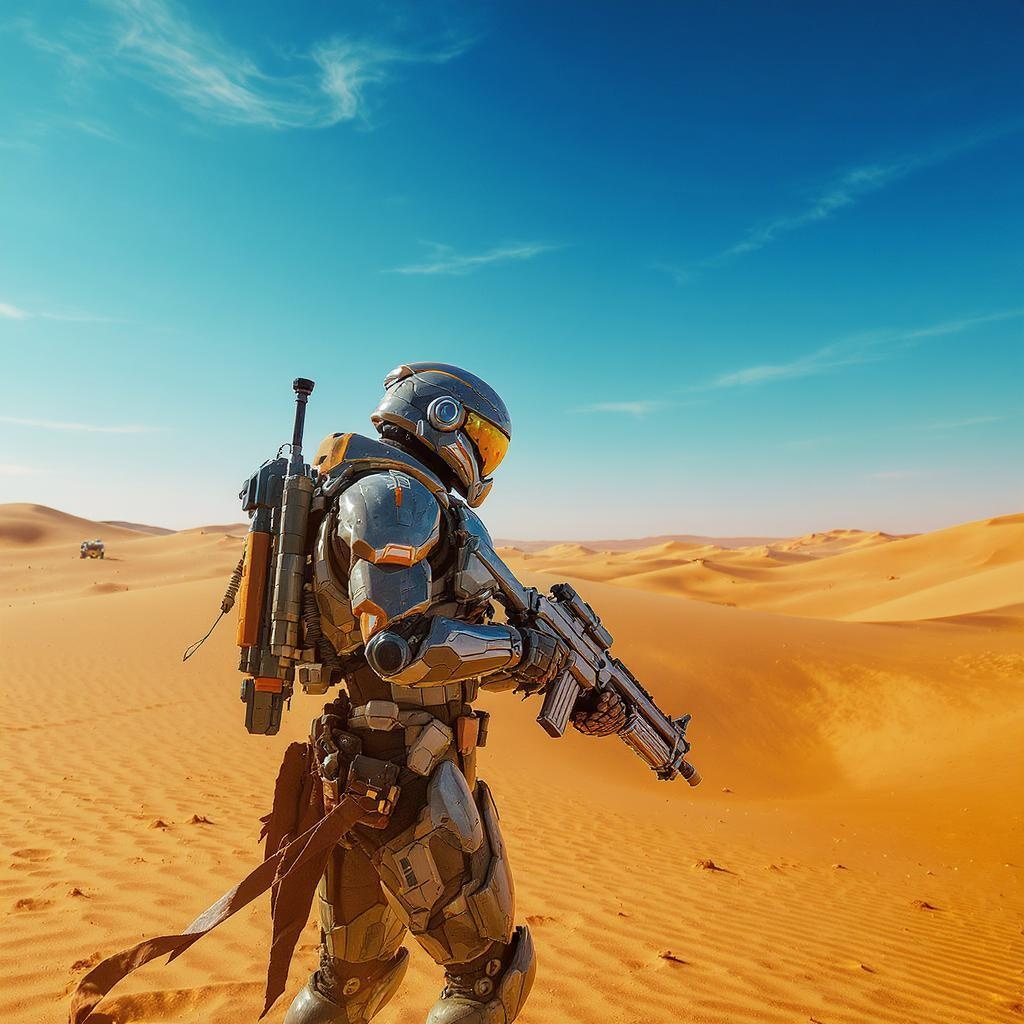 In a vast, open desert of a futuristic post-apocalyptic world, a lone peacekeeper from the security force stands guard, their presence a beacon of order in chaos. Clad in sleek, forged armor that glints under the harsh sun, this sentinel embodies the resilience of humanity. Equipped with a cutting-edge energy rifle, they gaze across the desolate landscape with a vigilant eye. The scene, captured in stunning wide-angle and cinematic composition, is awash in vivid HDR detail, emphasizing the stark beauty and relentless harshness of this new world, all in breathtaking 8k resolution.