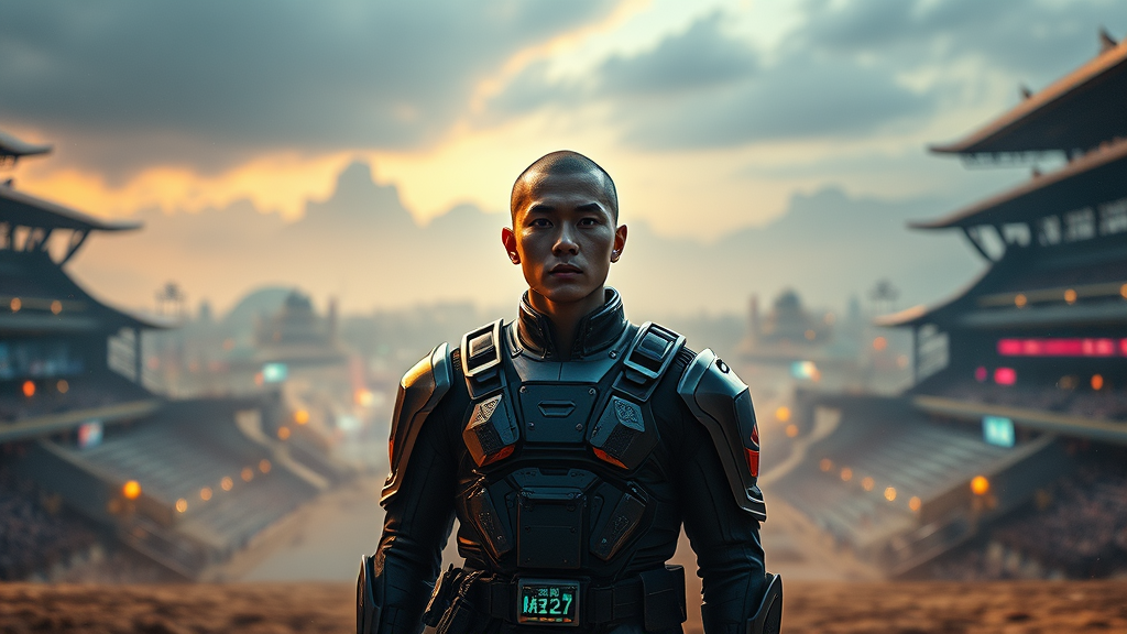 In a vast outdoor arena, a futuristic landscape unfolds as the wind gently lifts particles of dust. At the center, an Asian cyberpunk soldier, reminiscent of Wu Jing, stands with a commanding presence. His head is shaved, accentuating his sharp features and multifaceted visor that reflects the neon lights around him. The soldier's attire is a sleek blend of advanced armor and traditional elements, harmonizing the old with the new. His posture exudes confidence, as he surveys the vibrant, urban sprawl beyond the arena with a sense of purpose.