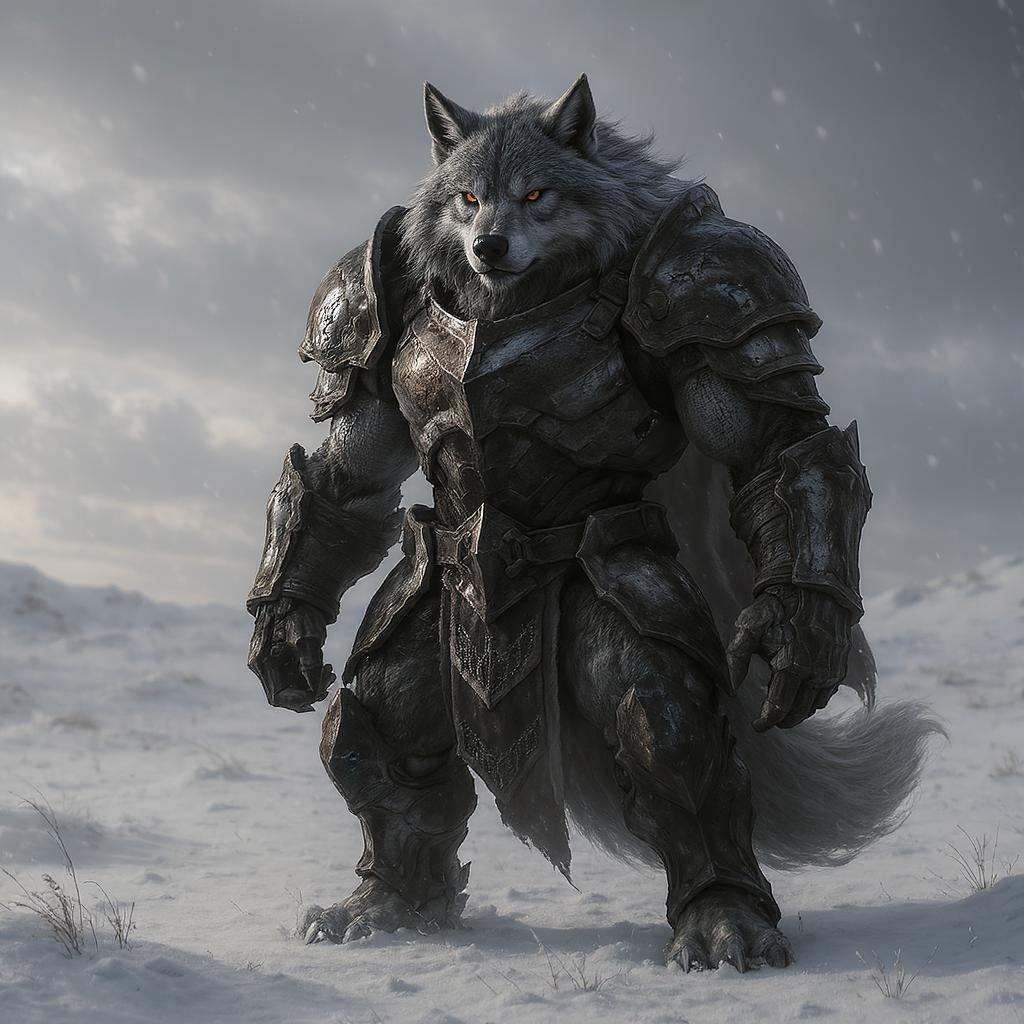 In a vast, snow-blanketed field, stands a fierce and imposing wolf warrior, an anthropomorphic figure exuding strength and mastery, reminiscent of a character from a high-fantasy realm. This figure embodies the essence of a D&D hero, captured in a dramatic product shot that highlights its detailed armor and battle-hardened features. The realism is striking, with hyper-detailed textures and cinematic lighting that give the scene an ultra-high-definition vibrancy, drawing you into a world of mythical adventures. The composition is crafted in a 9:16 ratio, offering a focused and immersive portrayal of this masterwork figure.