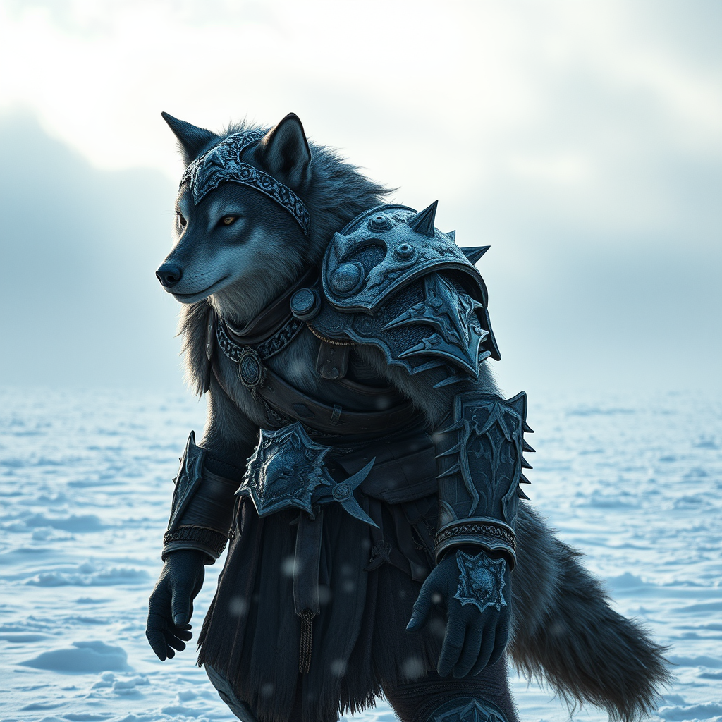 In a vast, snow-covered expanse stands a formidable wolf warrior, an anthropomorphic embodiment of primal strength and grace, shrouded in an aura of fantasy adventure. This creature's piercing eyes and intricate armor reflect its status as a masterwork character from a Dungeons & Dragons realm, captured with hyper-realistic detail and cinematic lighting that highlights every sinew and strand of fur in stunning 32k UHD quality. The atmosphere is both fierce and majestic, capturing a moment of poised intensity in a vertical composition reminiscent of a legendary product shot.