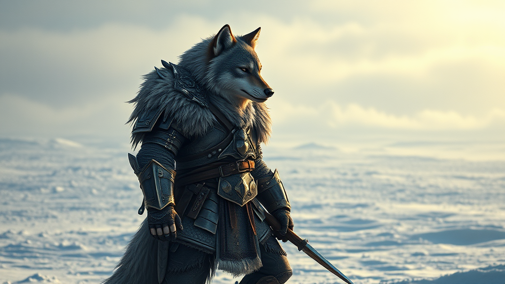 In a vast, snowy expanse, stands an imposing wolf warrior character, an anthropomorphic figure embodying the spirit of a fierce guardian, blending fantasy elements with a touch of D&D lore. This masterful creation exudes realism, showcasing hyper-detailed features under cinematic lighting, capturing the essence of dynamic storytelling. The scene is rendered in extremely high definition, reminiscent of a product shot that highlights every nuance of its fur and armor, creating an image both awe-inspiring and vivid, maintaining an aspect ratio of 9:16 for a dramatic vertical composition.