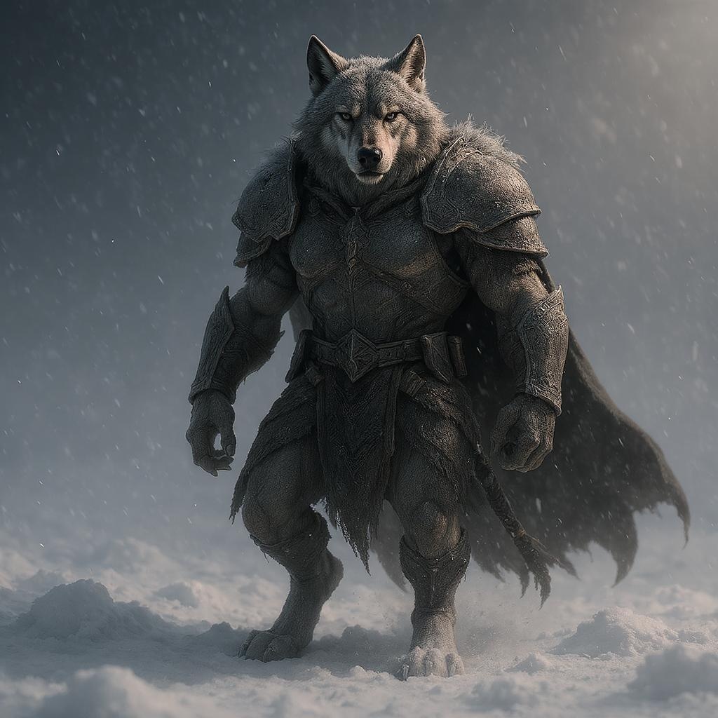 In a vast snowy field, stands a formidable wolf warrior, an anthropomorphic figure exuding power and grace, with a fantasy and d&d essence. This product shot showcases a masterwork of artistry, depicting a hyper-realistic and intricately detailed figure under dramatic cinematic lighting, captured in 32k UHD resolution, perfectly highlighting every nuance of its majestic form. The backdrop of snow provides a stark contrast to the warrior's fierce presence, evoking a sense of epic storytelling and adventure.